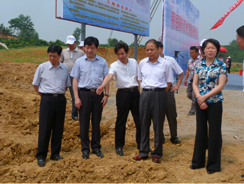 ![]() 市委書記萬勇(右二)、市長肖菊華(右一)、副市長鄭中華(左一)等領導觀摩施工現(xiàn)場