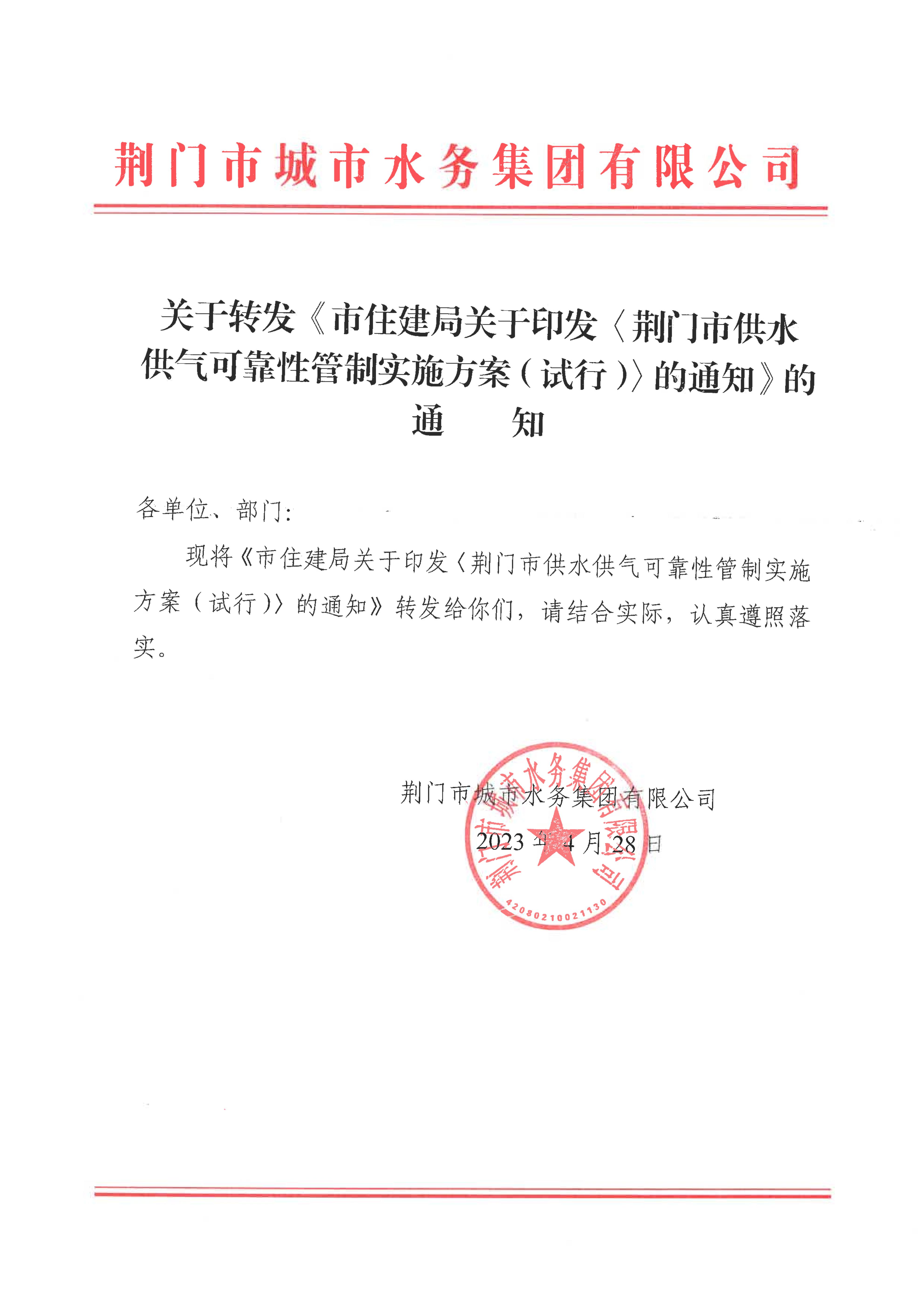 關(guān)于轉(zhuǎn)發(fā)《荊門市供水供氣可靠性管制實(shí)施方案(試行)》的通知
